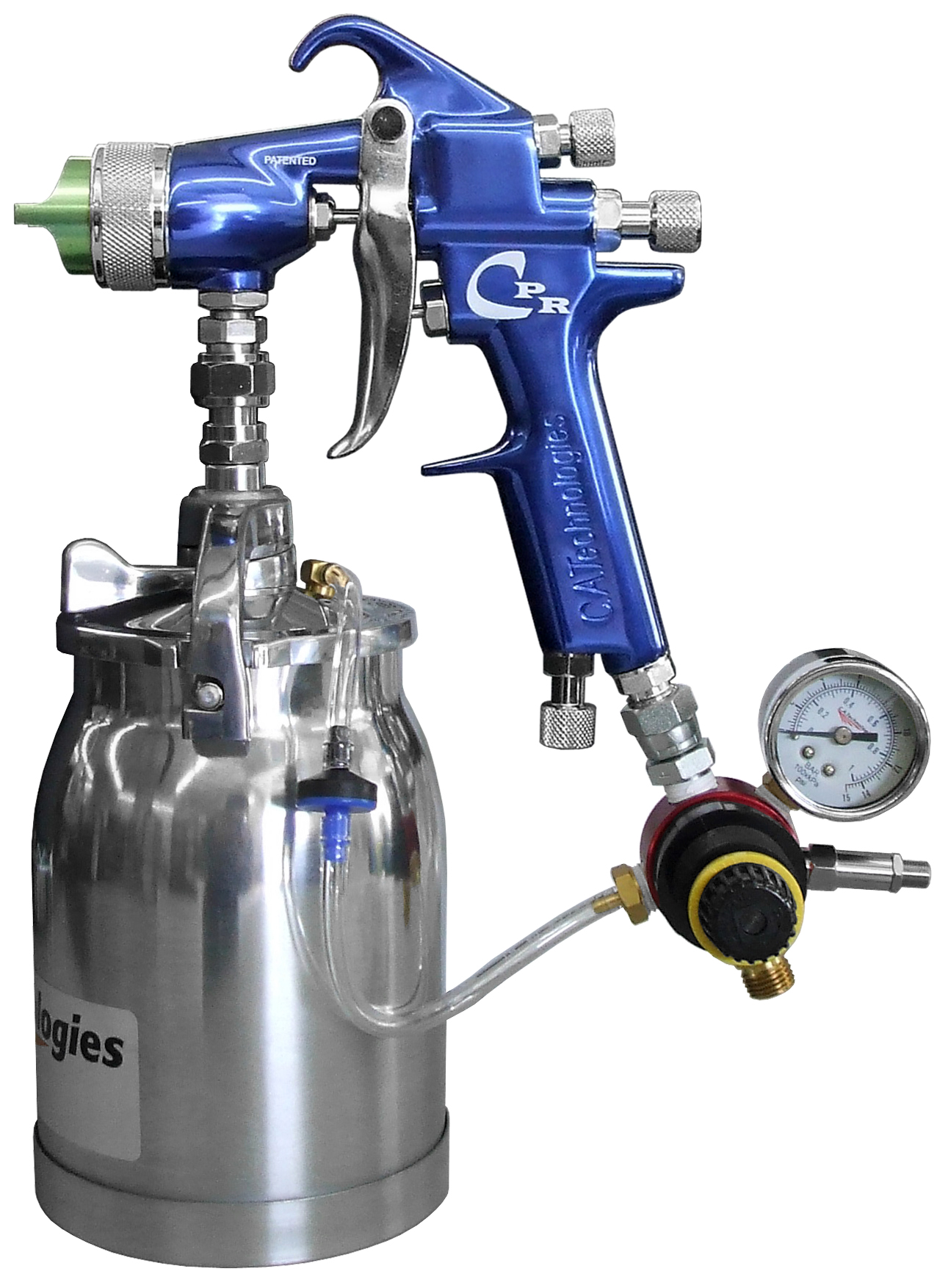 The CPR spray guns from CAT combine the transfer efficiency of HVLP with the speed and finish quality of conventional air spray. The nozzle requires 11cfm at 29 PSI recommended inlet pressure. The CPR guns available in the pressure versions include the new CPR air cap and the HVLP air cap, along with 3 different needle and nozzle sizes, multi-purpose wrench, nozzle wrench, cleaning brush and mini regulator. These kits will also be available with your standard 1qt 51-303-R2 pressure cups or the popular 3M PPS 1qt.